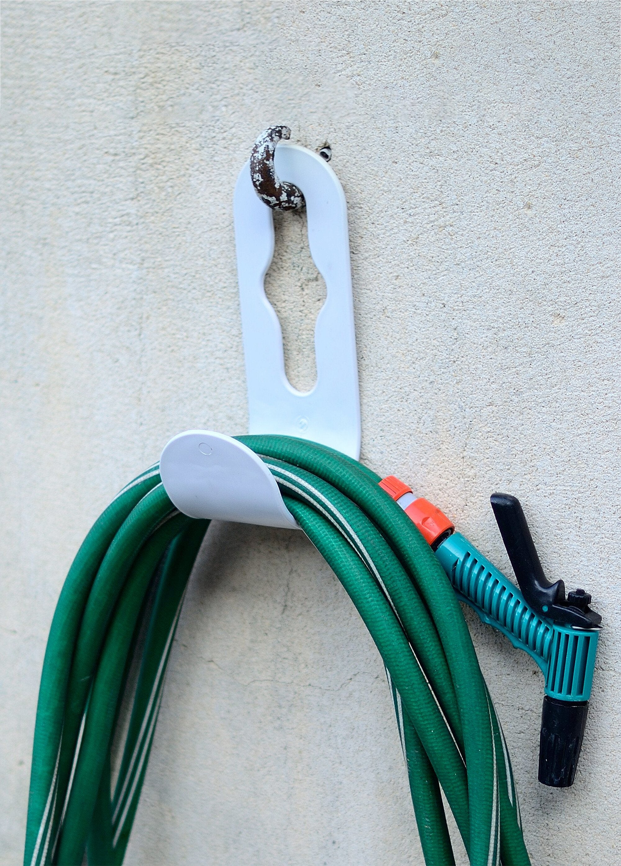 Quick and easy to install around the water inlet tap, without having to drill holes in the wall. It keeps your hose handy and tidy at all times.